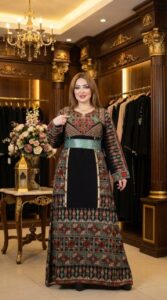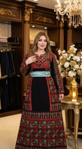 التطريز الغني يبرز جمال القطعة ويعطيها طابع تراثي أنيق، مع حزام يحدد الخصر ويبرز القوام بطريقة جذابة ومرتبة.