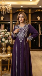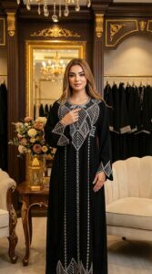 جلابية كويتي بتصميم أنيق وقصة انسيابية تبرز جمال القوام، مزينة بتطريز يدوي فاخر يضيف لمسة ملكية تلفت الأنظار من أول نظرة.