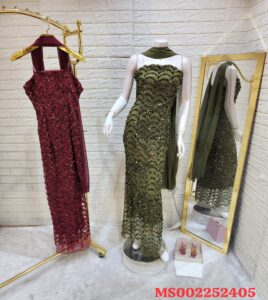فستان سهرة طويل بتصميم أنثوي أنيق يجمع بين البساطة والفخامة، مزين بتطريز ناعم يبرز جمال القصة ويعطي لمسة راقية بدون مبالغة. يأتي مع شال (وشاح) يكمل الإطلالة ويعطيك ستايل متكامل جاهز للمناسبة.