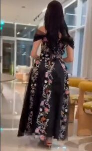 فستان سهرة بتصميم فخم يجمع بين اللون الأسود الكلاسيكي وتطريز وردي ناعم يضيف لمسة أنثوية جذابة