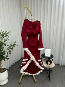 فستان سهرة أنيق بتصميم راقٍ يناسب المناسبات والسهرات الخاصة. يتميز باللون الأحمر الجذاب وقصة أنثوية تبرز جمال الإطلالة، مع تفاصيل كشكش أنيقة تضيف لمسة فخامة مميزة للتصميم.