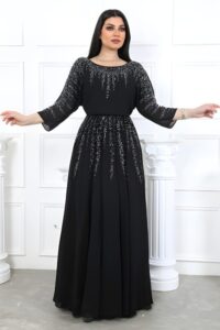 فستان سهرة أنيق بتصميم كلاسيكي فاخر، مصنوع من قماش الشيفون المطرز الذي يمنح الإطلالة لمسة فخمة ومميزة. يتميز بتفاصيل التطريز الراقية في الجزء العلوي مع قصة ناعمة تناسب السهرات والمناسبات الخاصة.